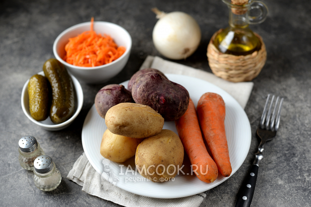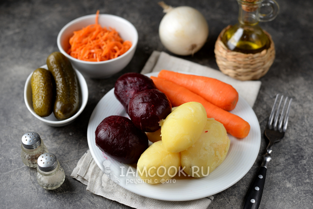 Подготовьте все продукты для винегрета с корейской морковкой по списку. Картофель, морковь и свеклу помойте под проточной водой жесткой кухонной губкой. Положите овощи в казан или кастрюлю, залейте чистой холодной водой и отварите до готовности. Для небольших клубней картофеля и моркови понадобится 15-20 минут, для небольшой свеклы может понадобиться от 30 до 45 минут. Готовность проверьте ножом.