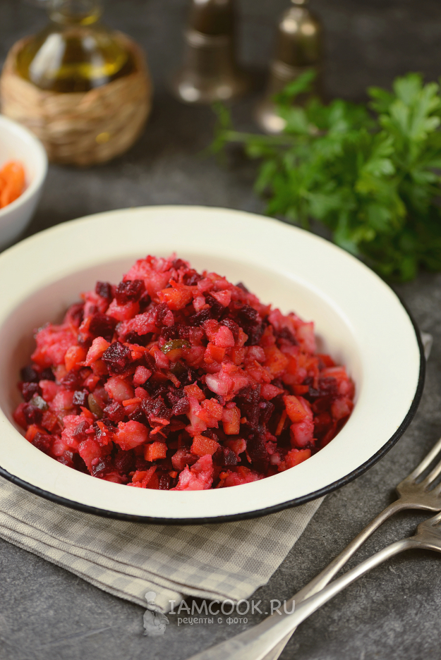 Винегрет с корейской морковкой готов к подаче на стол. Очень вкусный и ароматный, рекомендую.