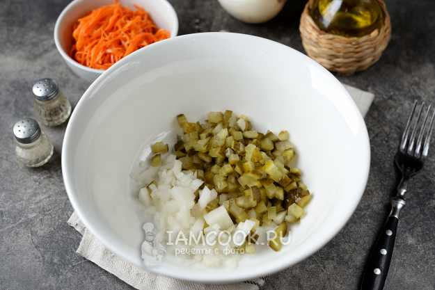 Первым делом нарежьте кислые огурцы и репчатый лук мелким кубиком, положите в глубокую миску, перемешайте. Пока будете нарезать остальные ингредиенты, огуречная кислота слегка замаринует лук.