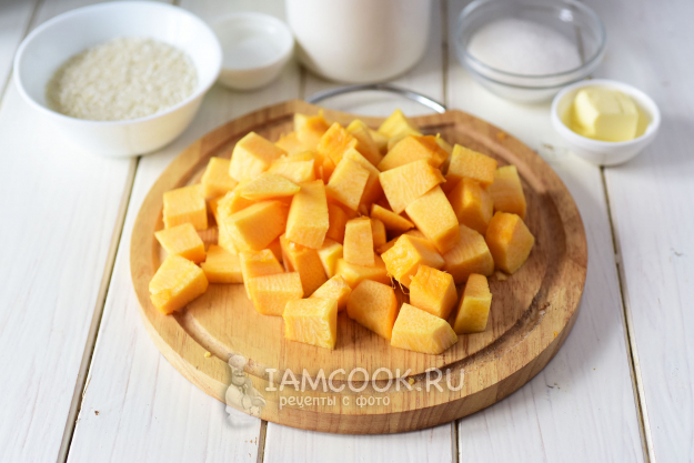 Мякоть тыквы нарежем кубиками с размером стороны примерно в 1,5-2 см.