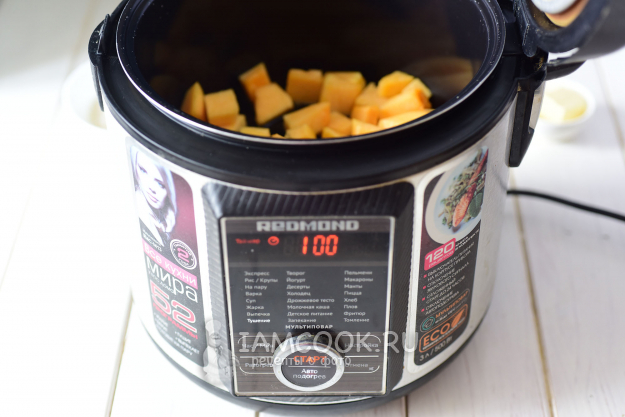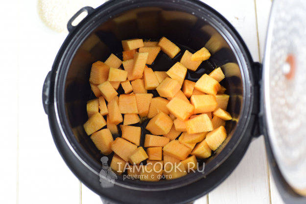 Кубики тыквы выложим на дно чаши мультиварки, зальем 50 мл воды.