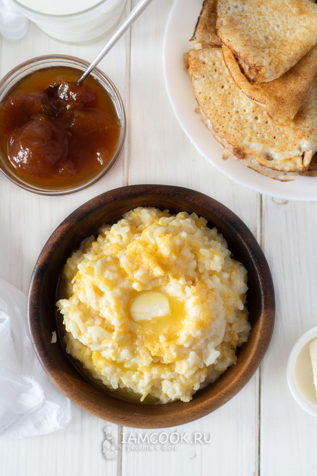 После финального сигнала мультиварки готовую рисовую кашу с тыквой сразу же разложим по порционным тарелкам, в каждую положим по кусочку сливочного масла.