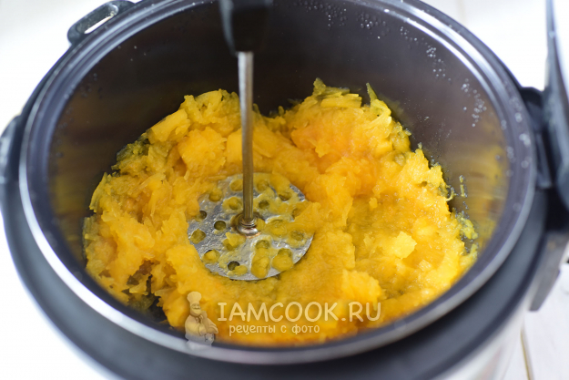 За это время кусочки тыквы стали достаточно мягкими. Подавим толкушкой тыкву по возможности.