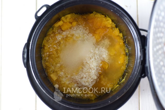 Выложим к тыкве рис, зальем воду, добавим сахар и соль.