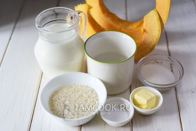 Возьмём необходимые ингредиенты для приготовления рисовой каши с тыквой в мультиварке Редмонд. Рис промоем до прозрачной жидкости. С тыквенных кусочков снимем кожуру и удалим семена и волокна.