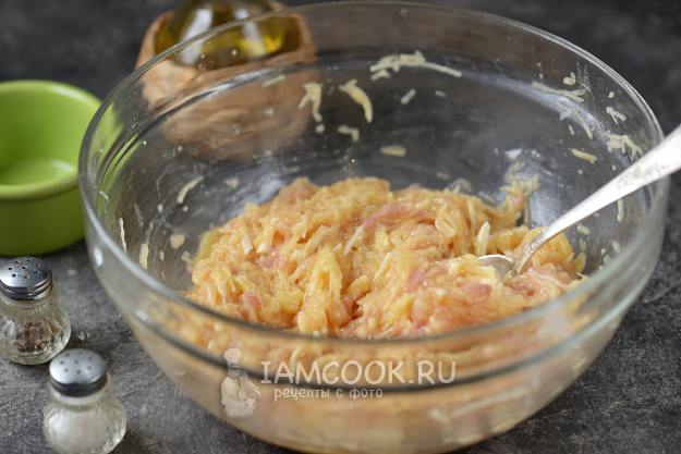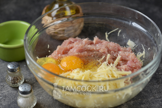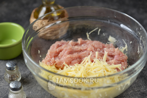 Добавьте к картофелю куриный фарш и натертый твердый сыр. Сыр лучше брать того сорта, который не слишком плавится при высокой температуре.