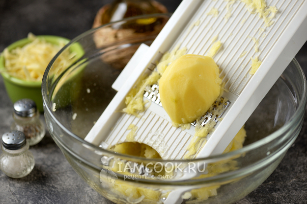 Натрите картофель на самой мелкой терке тоненькой стружкой, тщательно отожмите всю жидкость. Дальше натрите лук.