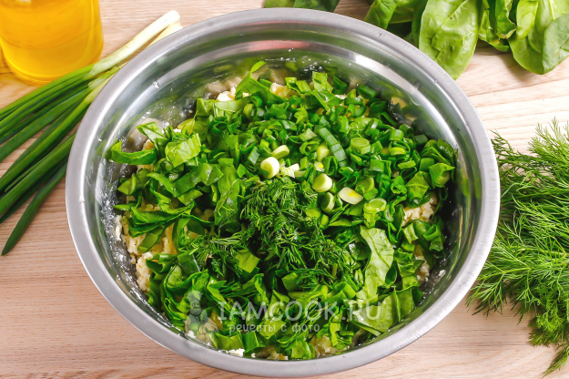 Промойте листья шпината, срезав стебли и отделив их друг от друга. Промойте укроп и зеленый лук. Обсушите всю зелень с помощью бумажных полотенец, удаляя лишнюю влагу. Шпинат нарежьте лентами, зеленый лук и укроп измельчите и добавьте всю зеленую массу в емкость, тщательно перемешайте.