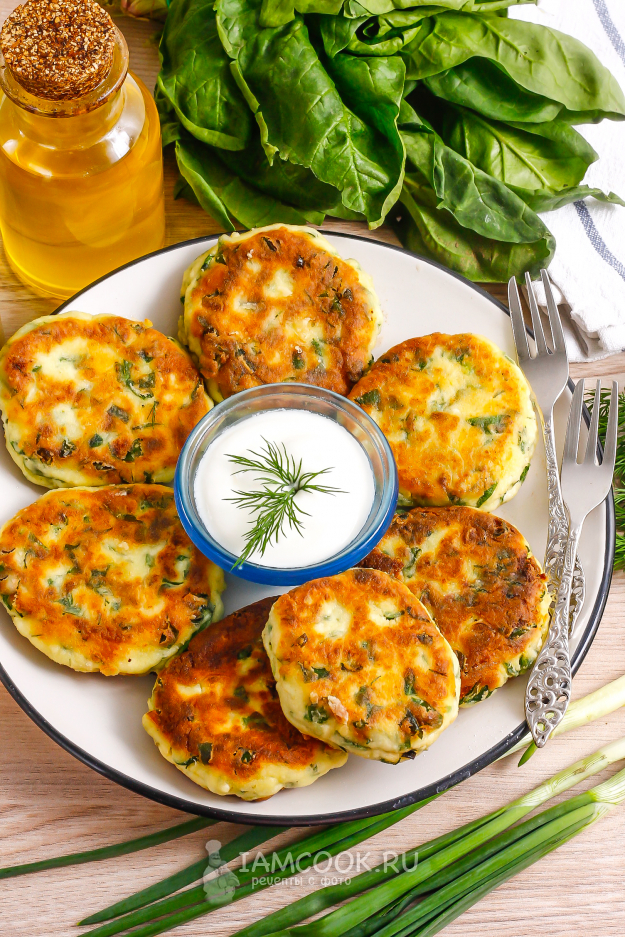 Выложите румяные сырники со шпинатом на тарелку и подайте к столу со сметаной или густым классическим йогуртом.