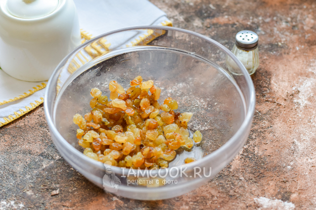 Параллельно подготовить изюм - переложить его в миску, обязательно залить кипятком и оставить на 10 минут. После воду слить.