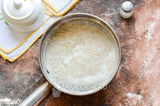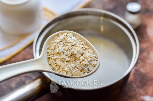 Молоко довести до кипения, всыпать овсяные хлопья. При постоянном помешивании довести молоко до кипения, убавить огонь на минимум, варить кашу под крышкой 3-4 минуты.