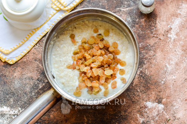 Добавить в кашу изюм. Также можно добавить кусочек масла или творожок. Перемешать все хорошо и настоять под крышкой 3-4 минуты. После овсяную кашу с изюмом можно подавать к столу.