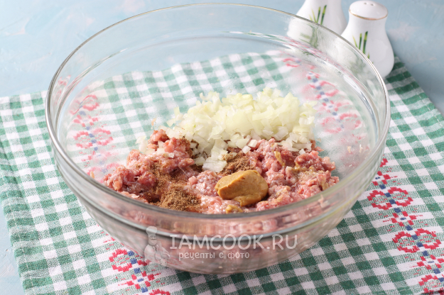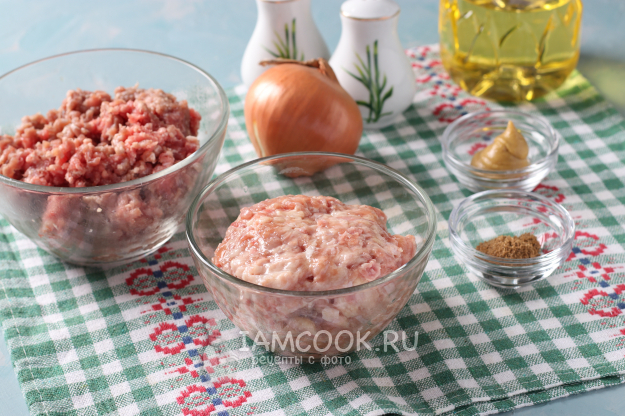 В глубокой миске смешать оба фарша. Добавить нарезанный мелким кубиком лук, горчицу и кориандр.
