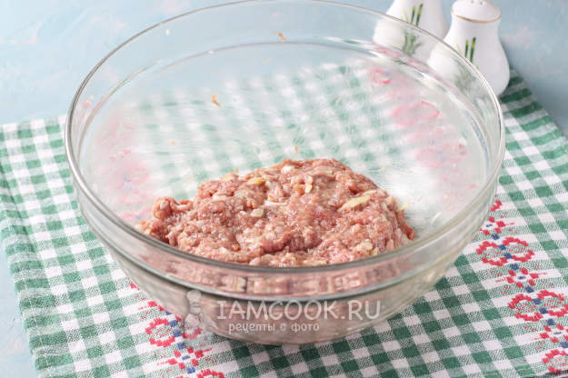 Фарш посолить и поперчить, тщательно перемешать, выбить лишний воздух. Дать фаршу минут 20 для стабилизации.