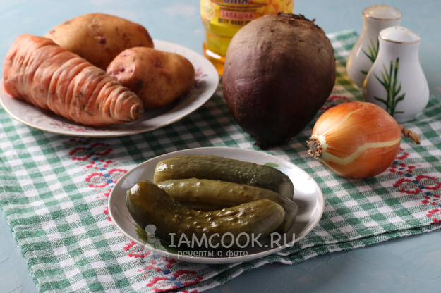 Для приготовления винегрета с маринованными огурцами подготовить из списка необходимые ингредиенты.