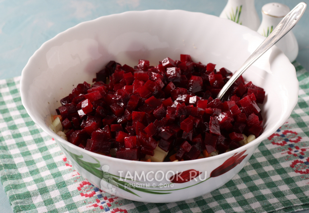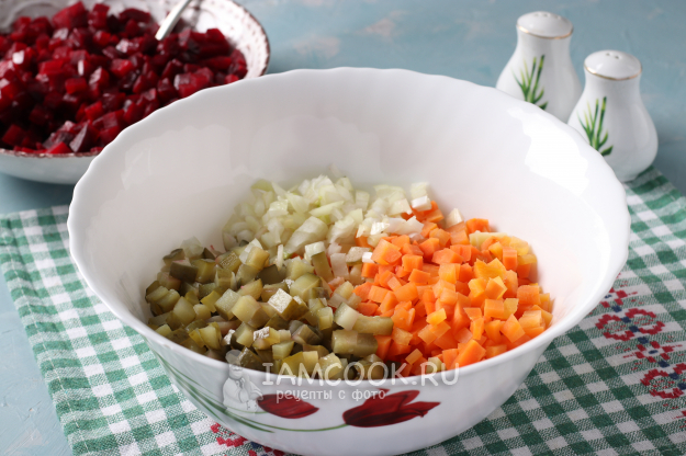 Свеклу нарезать кубиком, поместить в отдельную миску, заправить постным маслом (3 ст.л.) и перемешать. Это делается для того, чтобы свекла не окрасила все остальные овощи. Нарезать кубиками картофель, морковь, огурцы и лук, сложить в глубокую миску.