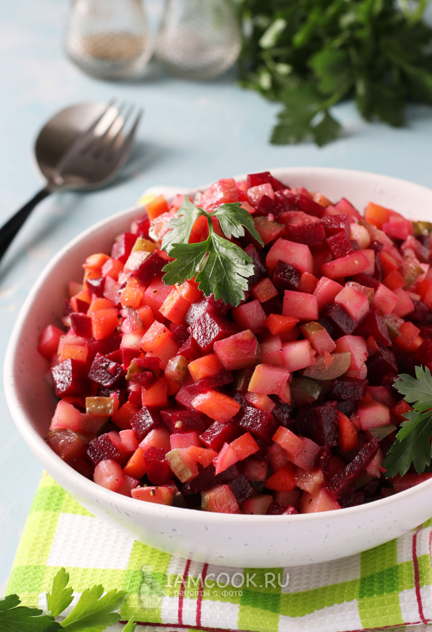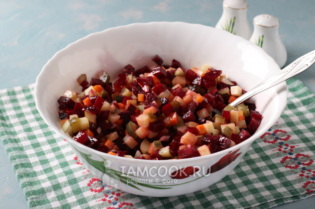 Ещё раз хорошо перемешать все овощи и убрать винегрет на 1 час в холодильник, чтобы он настоялся.