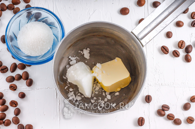 В это время выложите кокосовое и сливочное масло в небольшой ковш и растопите на плите. Можно воспользоваться микроволновкой, растапливая в ней масло, но не до кипения. Желательно в таком случае накрыть емкость с маслом специальной пластмассовой крышкой для микроволновки, чтобы оно вдруг не забрызгало стенки техники.