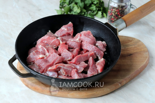 Говядину также промойте, обсушите и нарежьте небольшими порционными кусочками, можно квадратиками или длинными полосочками, как в моём варианте. Выложите мясо на хорошо разогретую с растительным маслом сковороду. Обжарьте его на сильном огне до появления румяной корочки, периодически помешивая.