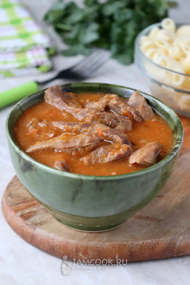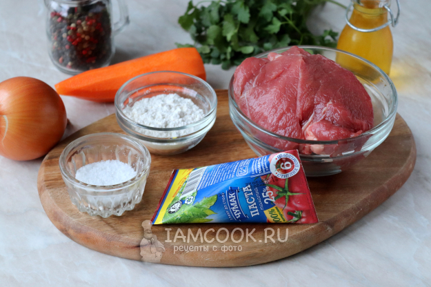 Томите говядину на минимальном огне около 40-60 минут, до мягкости. По надобности в ходе приготовления можно доливать воду и добавлять специи. Также не забывайте периодически помешивать, учитывая, что подлива получается густой за счёт муки и может подгореть.