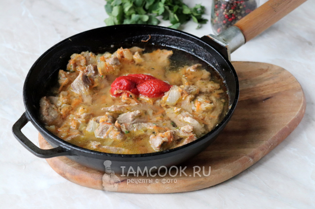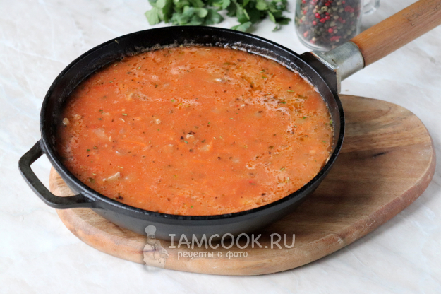 Содержимое сковороды залейте горячей водой, добавьте томатную пасту, щепотку сахарного песка и итальянские травы (по желанию).