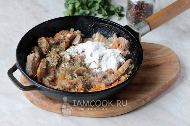 К мясу и овощам всыпьте пшеничную муку, посолите и поперчите по вкусу. Перемешайте, чтобы специи равномерно распределились.