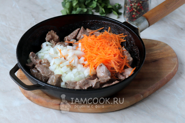 Тем временем измельчите овощи. Лук нарежьте кубиками, морковь натрите на тёрке со средними ячейками. Овощную нарезку добавьте к мясу. Жарьте всё вместе 5-7 минут на среднем огне до мягкости, помешивая.