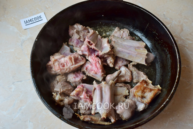 Выбирайте просторную, глубокую сковороду. На горячую сковороду выложите подготовленные бараньи ребрышки. Обжарьте их на сильном огне с добавлением небольшого количества растительного масла. Все ребрышки должны подрумяниться со всех сторон.