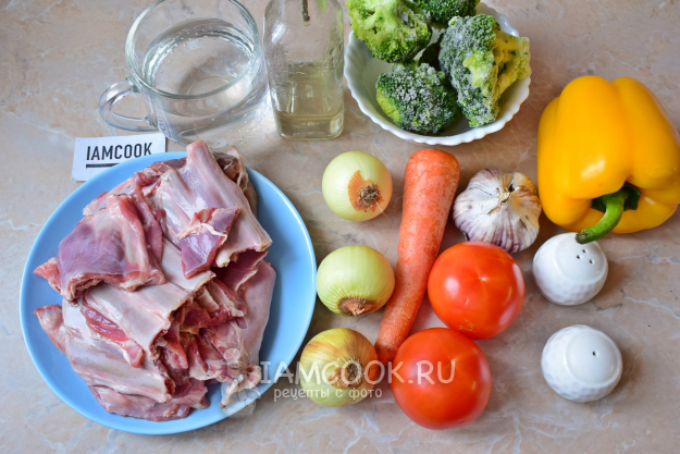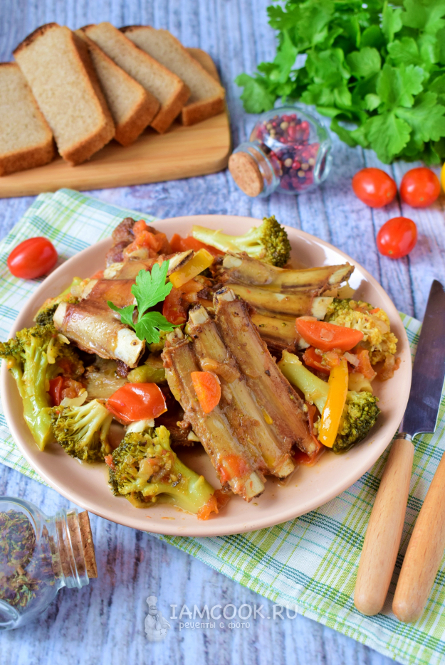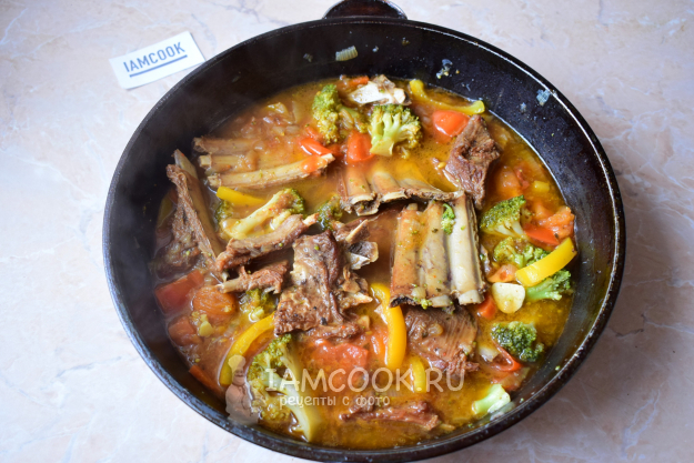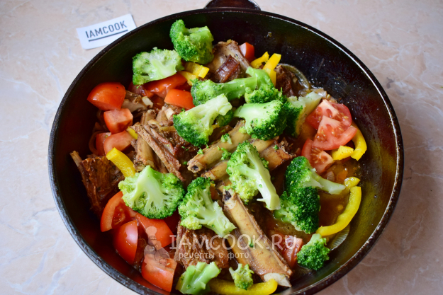 Спустя час тушения мясо на ребрышках станет мягким. Добавьте в сковороду нарезанные помидоры и болгарский перец. Добавьте брокколи. Если используете брокколи из морозилки, то предварительно размораживать их нет необходимости.