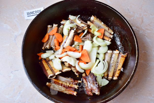 Лук и морковь очистите. Морковь можно нарезать кружочками или брусочками. Лук нарежьте полукольцами. Добавьте овощи в сковороду к ребрышкам. Перемешайте и обжарьте все вместе еще 3-4 минуты. Затем подлейте в сковороду немного горячей воды и тушите ребрышки под крышкой, на небольшом огне в течение часа. По необходимости воду можно подливать, чтобы ребрышки не начали подгорать.