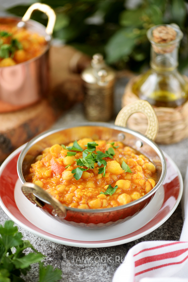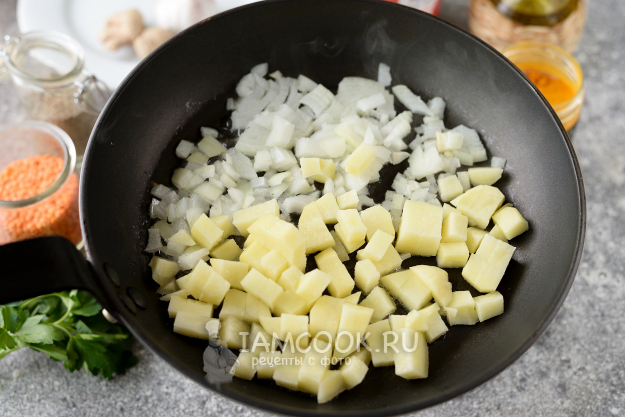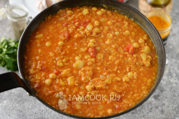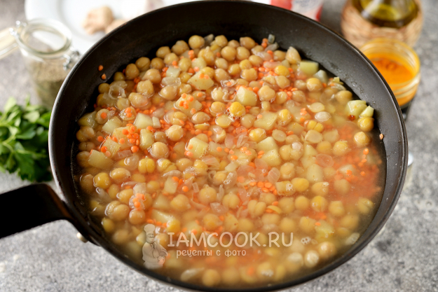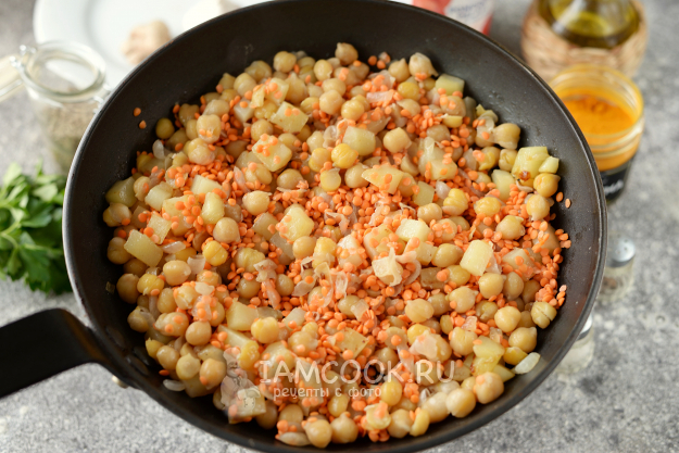 Когда картофель и лук будут полностью готовы, добавьте вареный нут, всыпьте промытую чечевицу.