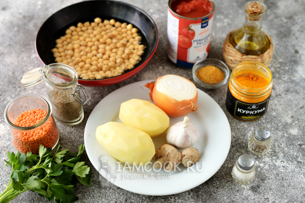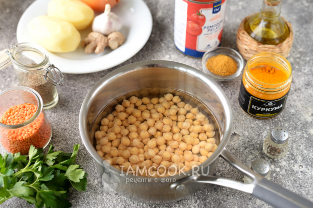 Подготовьте все продукты для вегетарианского карри. Нут промойте, залейте холодной водой и дайте ему набухнуть, лучше это делать с вечера. Картофель, лук, чеснок и имбирь почистите, помойте и обсушите.