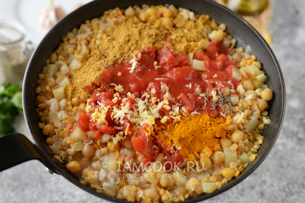 Чечевица за это время немного разварится. Теперь добавьте помидоры в соку, измельченный чеснок и имбирь, всыпьте карри, куркуму и зиру. Долейте воды и продолжайте тушить на тихом огне еще 5-7 минут.