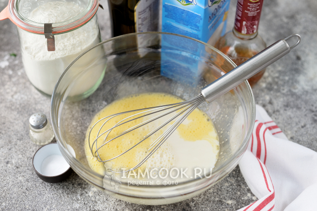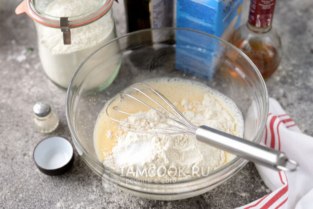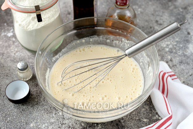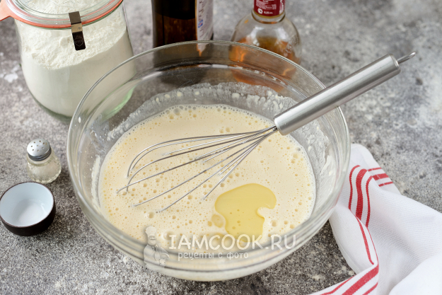 Теперь влейте уксус и масло, в последний раз хорошенько взбейте тесто и приступайте к выпечке блинов.