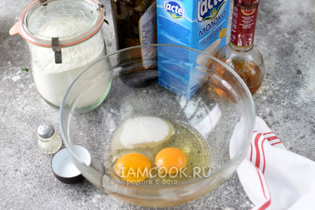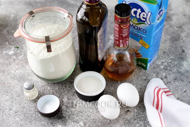 Возьмите продукты для приготовления тонких блинчиков с дырочками на горячем молоке.