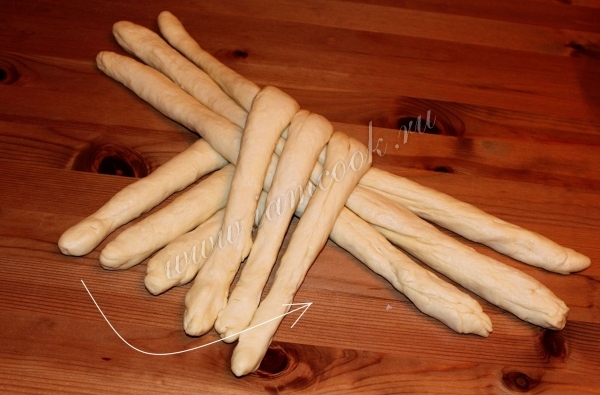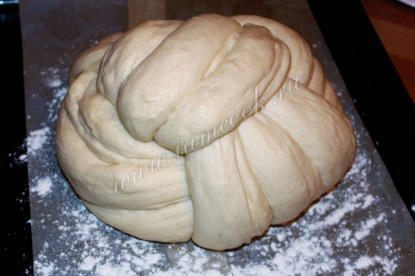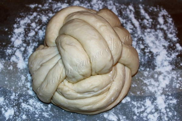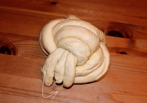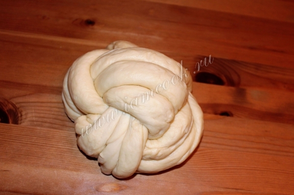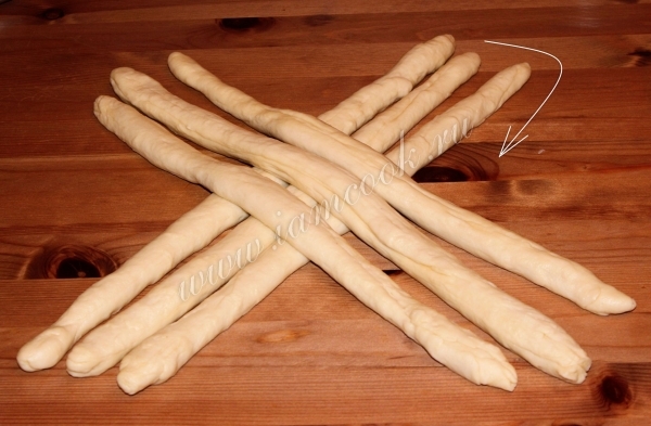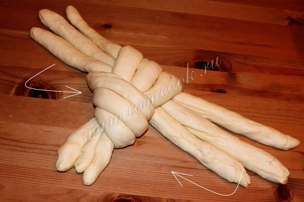 Тесто обомните и разделите на 6 равных частей. Каждую часть раскатайте в жгут длиной 40 см. Чтобы было удобнее работать присыпьте слегка рабочую поверхность мукой. Жгуты соедините по три и уложите крестом. Далее нижними тремя жгутами перехлестните верхние.