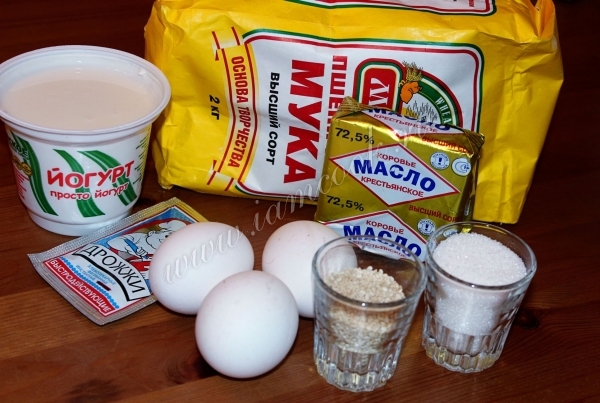 Быстродействующие дрожжи перемешайте с просеянной мукой, добавьте йогурт, сахар, соль, 2 яйца, размягченное сливочное масло. Замесите тесто, оно не должно липнуть к рукам, но должно быть мягким как мочка уха (Вымешивайте не менее 10 минут.) Затем округлите и уберите в глубокую посуду в теплое место до увеличения в 2-3 раза.