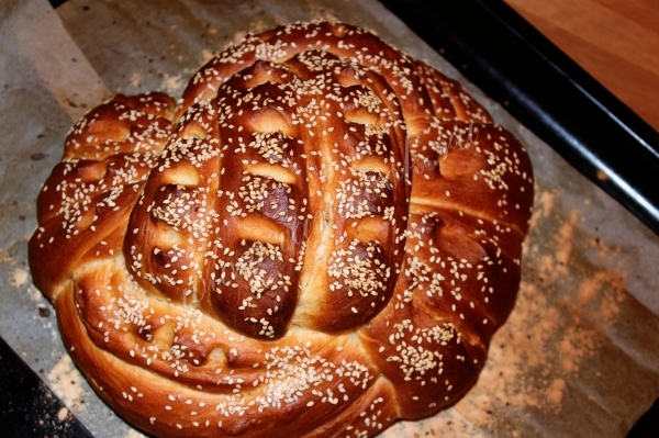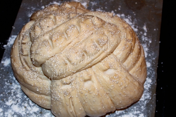 Перед выпечкой смажьте плетенку крепко заваренным чаем или просто яйцом, посыпьте кунжутом. С помощью ножниц сделайте несколько неглубоких надрезов на жгутах.