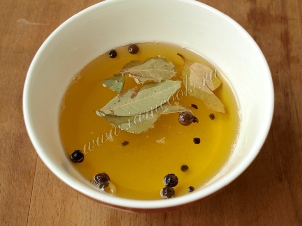 Маринад приготовить пока грибы будут пускать сок: соединить растительное масло с уксусом, солью и сахаром, перемешать, добавить чёрный и душистый перец горошек и лавровый лист.