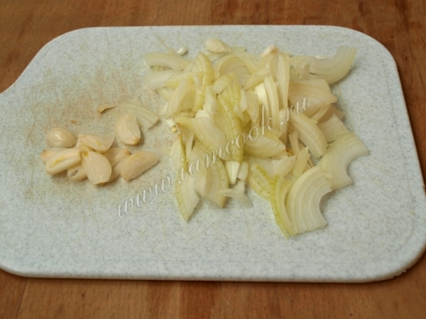 За это время луковицу нарезать полу или четверть кольцами, а чеснок пластинами.