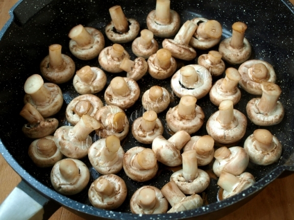 Разогреть сковороду и ничем не смазывая выложить на неё грибы шляпками вниз. Жарить чтоб грибы немного пустили сок минут 6.