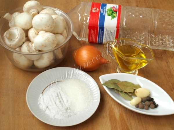 Для приготовления маринованных шампиньонов нам понадобится их 500 граммов, лук репчатый, соль, сахар, лавровый лист, перец чёрный и душистый горошек, чеснок, уксус и растительное масло.