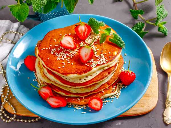 Сковороду хорошо разогреть, в центр наливать по 2 столовых ложки теста, размазывать не нужно, тесто само растекается до нужного диаметра. Жарить на небольшом огне, пока верх панкейка не станет сухим.