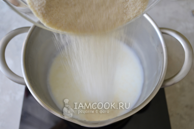 Влейте в кастрюлю молоко и воду, добавьте сахар и соль, доведите до кипения и всыпьте манную крупу.