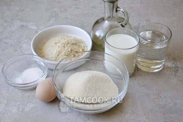 Возьмите продукты для приготовления манников из манной каши на сковороде.