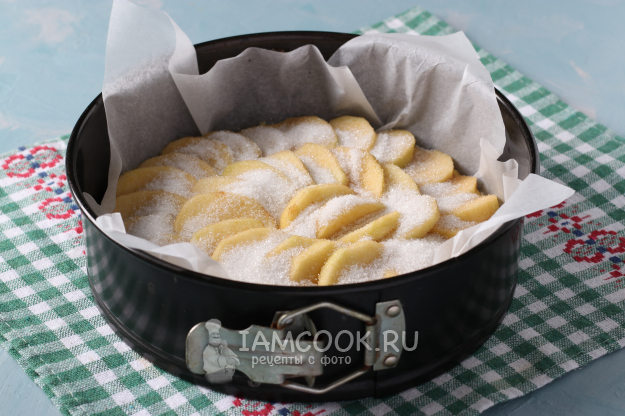 Форму можно смазать сливочным маслом и обсыпать мукой, но мне больше нравится застилать пергаментом. Вылить тесто в форму, сверху разложить яблоки внахлёст и посыпать их оставшимся сахаром.
