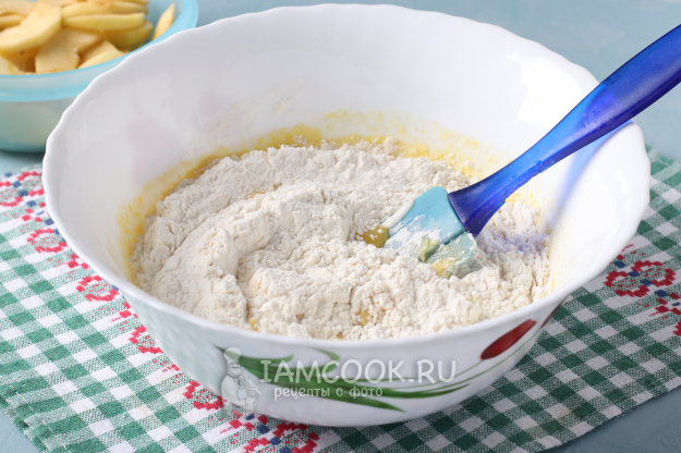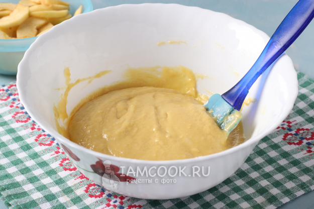 Яблоки вымыть, почистить и удалить семечки. Нарезать яблоки тонкими ломтиками. Можно сбрызнуть яблоки лимонным соком, чтоб они не потемнели, пока вы будете готовить тесто.