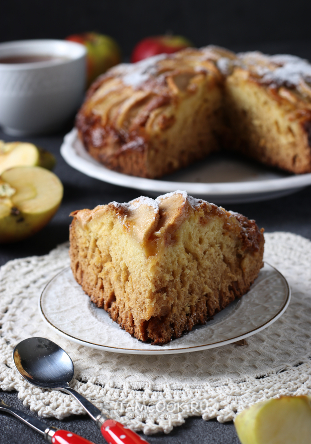 Посыпать шарлотку сахарной пудрой, разрезать на кусочки и подать к столу.