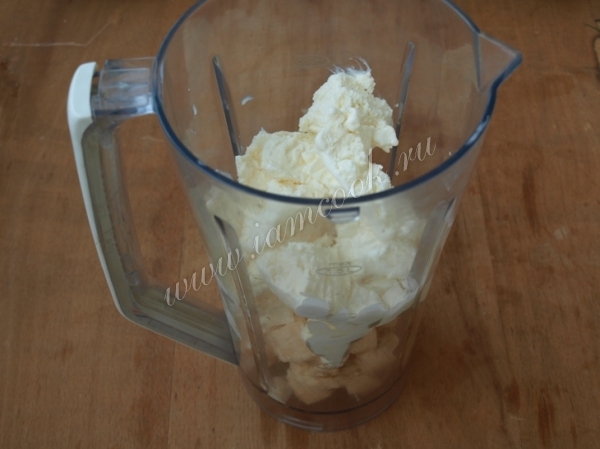 Бананы поломать на кусочки,сложить в чашу блендера. Добавить мороженое.