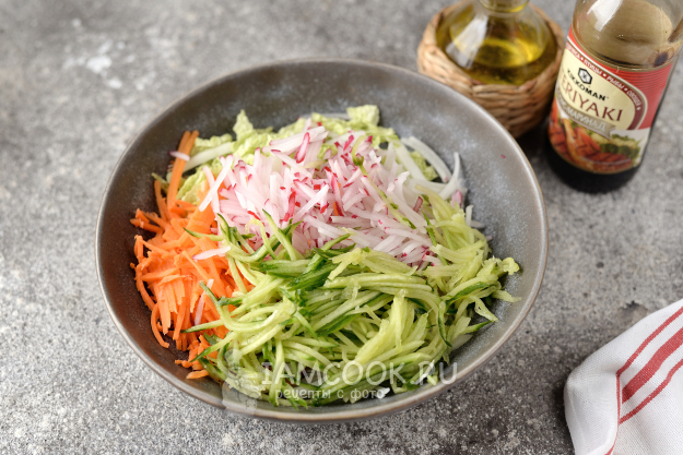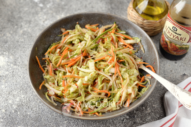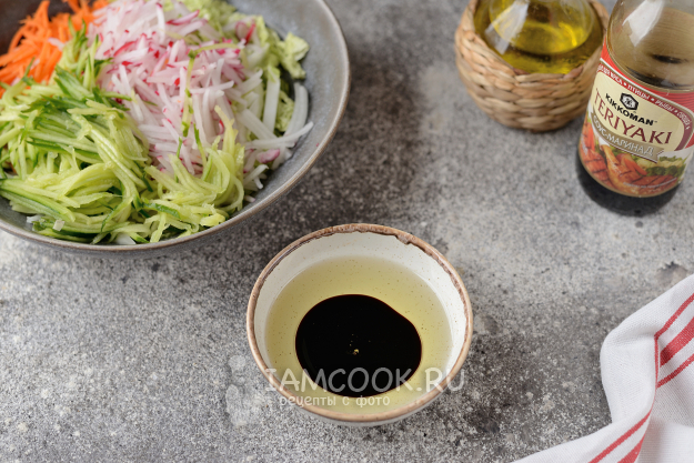 В удобной пиалочке взбейте соус терияки и оливковое масло. При желании в заправку можно добавить измельченный чеснок и имбирь. Если у вас найдется кунжутное масло - будет намного вкуснее и ароматнее.